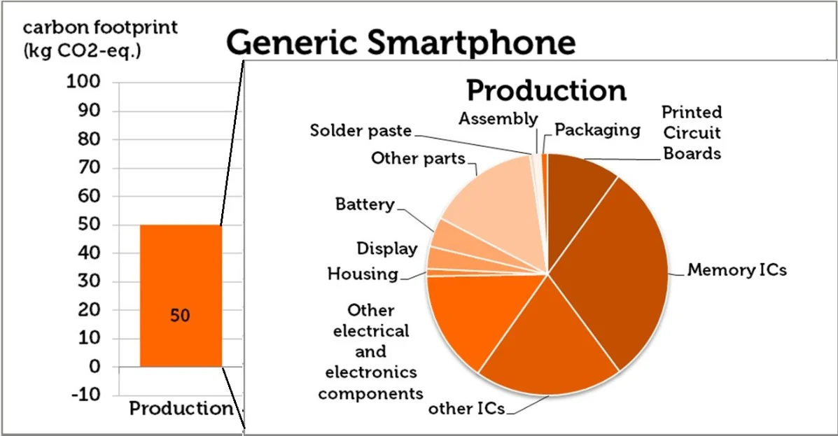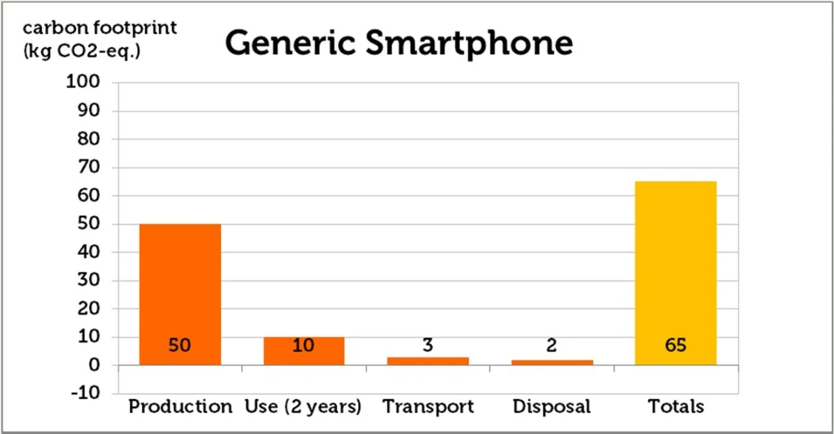 One of the most common questions about a product’s footprint is about greenhouse gas emissions. These are mainly related to the highly-complex production process – and less about how a phone is used (eg, how much electricity it consumes). That means, a device should be used as long as possible! I’m including the graphics below to give an overview of the carbon footprint of a generic smartphone (production, use, transport, and disposal).