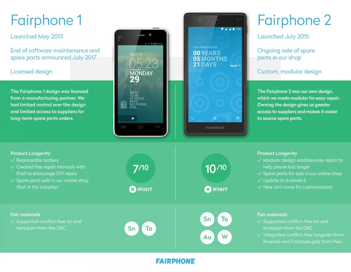 As our company continues to grow in size and ambition, it’s only natural that our products will evolve along with it. But the phone and brave owners who started it all will always have a special place in our hearts. While we may no longer be able to support the Fairphone 1, we want to encourage owners to keep using their phones as long as they can (using maintenance tips we’ve shared by email). No matter where the future takes us, we’re excited to have our community by our side as we keep working towards fairer products.