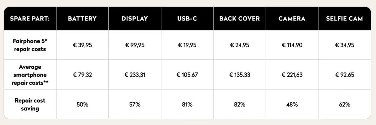 This brings us to the hardware side of things: Repairs are another hidden cost many people don’t factor in when choosing a new device. On average, getting a broken display fixed on a non-Fairphone device can cost upwards of €200 – at least. Not to mention, you have to leave your busted phone at a repair center for days. Changing the display on the Fairphone costs half of that, coming in at €99, and you can do it at home within minutes. Swap in a new battery for less than €40 or replace camera units for anywhere between €40 and €70. Replacing the USB-C port can go up to €130 with other brands; we offer a brand new USB-C port for less than €20! On average, when it comes to spare parts, we’re roughly 63% cheaper compared to the big brands in the industry.