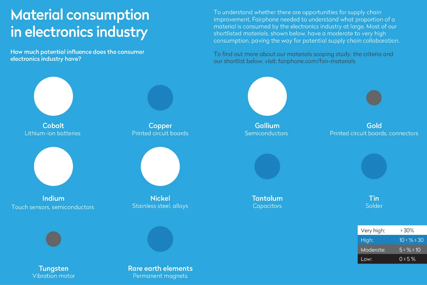 And in the spirit of collaboration, we’d like to encourage everyone to share*, use and build upon our and TDI’s research. If you have any information that you think could contribute to our materials scoping research or improvement efforts, we’d be very happy if you can let us know. Finally, while we completed this study with the Fairphone 2 in mind, we also see the value of expanding it to a wider range of materials and potentially develop an open source database. If you would be interested in using or co-developing such a database, please add your name to this list and we will contact you when there is enough interest for a follow up.