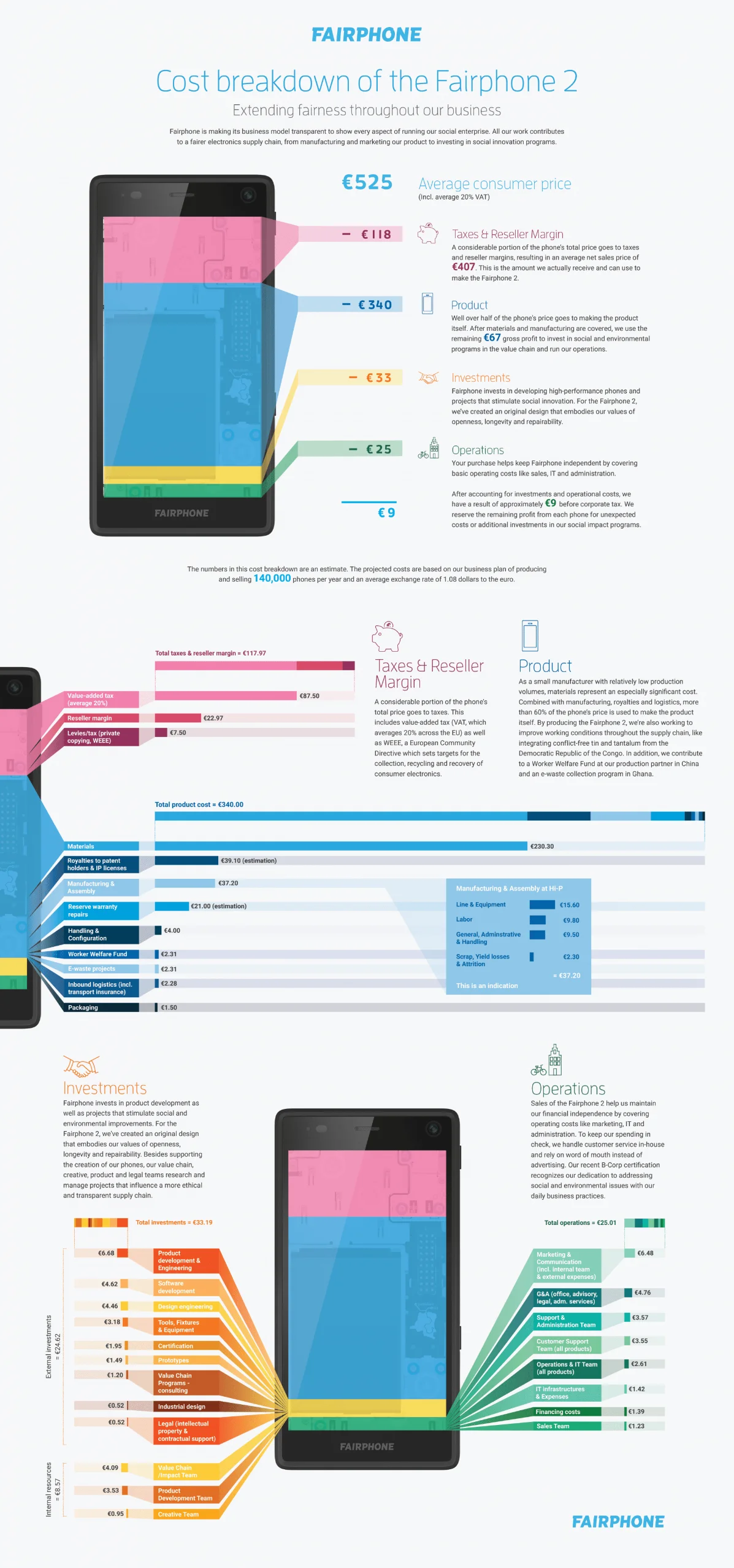 A considerable portion of the phone’s consumer price (nearly a fifth!) goes to taxes. This includes the value-added tax (VAT) as well as WEEE, a European Community directive which sets targets for the collection, recycling and recovery of consumer electronics. It also covers margins for our reseller partners to ensure that they can pay for costs and services related to distributing the phone as well as receive a marginal profit. Once the taxes are paid and these margins are taken into account, we receive an average of €407 for each Fairphone 2 sold.