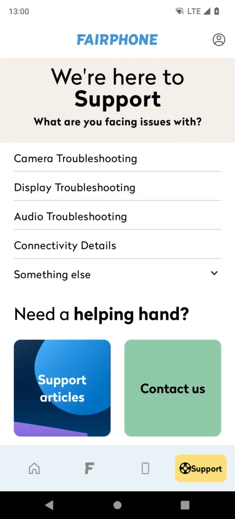 The Support tab is where you can go through our extensive collection of troubleshooting articles and videos to make sure your Fairphone journey is as smooth as ever. You can also launch multiple hardware tests to resolve issues quickly at your end. And in case you’re still stuck, you can directly reach out to the superstars at customer support to walk you through possible next steps.