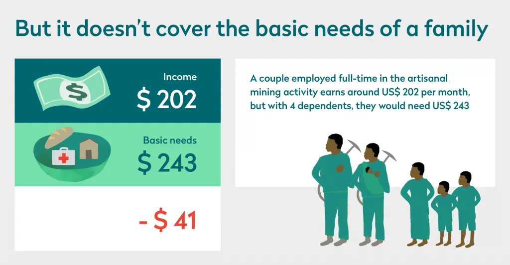 One of the key findings of the report was that ASM tin miners in the DRC don’t earn enough to cover the needs of their families. For example, in eastern DRC, a couple employed full-time in the artisanal mining sector might earn a combined income of USD 202. However, with an average of four dependents, they would need USD 243 to cover their basic needs.